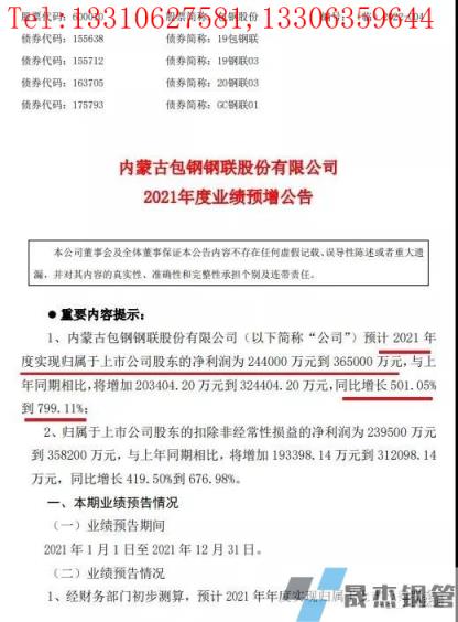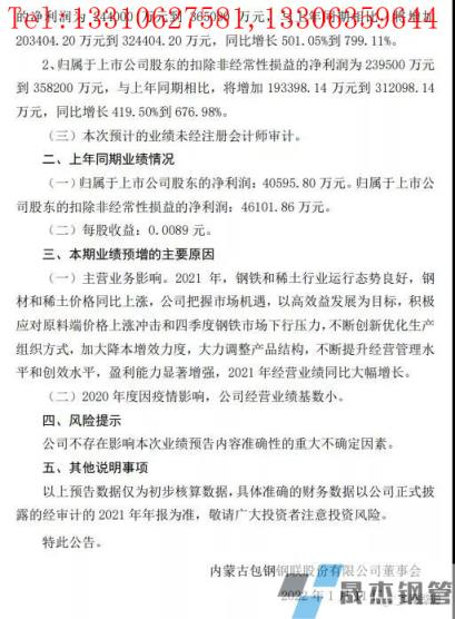 1月11日晚,鋼鐵板塊的牛股包鋼股份公布業(yè)績預(yù)告,預(yù)計(jì)2021年度實(shí)現(xiàn)歸屬于上市公司股東的凈利潤為24.4億元到36.5億元,與上年同期相比,將增加20.34億元到32.44億元,同比增長501.05%到799.11%;歸屬于上市公司股東的扣除非經(jīng)常性損益的凈利潤為23.95億元到35.82億元,與上年同期相比,將增加19.34億元到31.21億元,同比增長419.50%到676.98%。