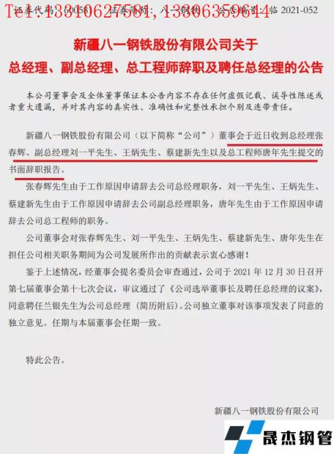 2021年12月31日,八一鋼鐵發(fā)布公告,董事會于近日收到沈東新先生辭去董事長職務(wù),張志剛先生、姜振峰先生辭去董事職務(wù)的書面辭職報(bào)告??偨?jīng)理張春輝、副總經(jīng)理劉一平先生、王炳先生、蔡建新先生以及總工程師唐年先生提交書面辭職報(bào)告。