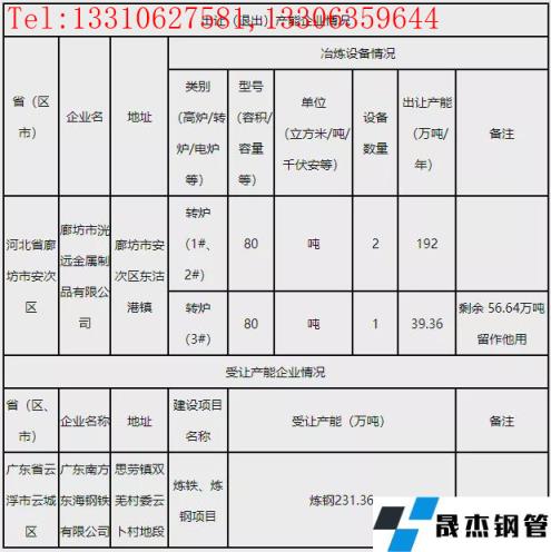 1月12日,河北工信廳發(fā)布變更廊坊市洸遠(yuǎn)金屬制品有限公司部分產(chǎn)能出讓方案。方案表明,廊坊市洸遠(yuǎn)金屬制品有限公司擬出讓80t轉(zhuǎn)爐3座給廣東南方東海鋼鐵有限公司,共計(jì)出讓煉鋼產(chǎn)能231.36萬噸,剩余56.64萬噸留作他用。