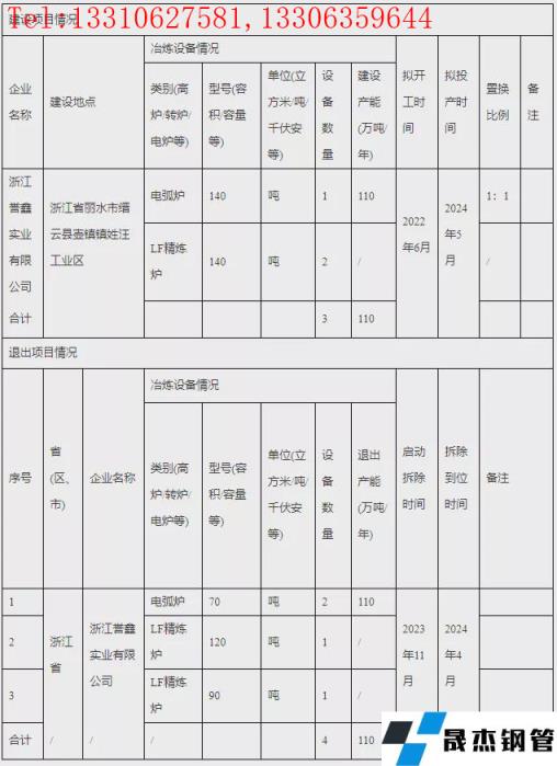 2022年1月7日,浙江省經(jīng)信廳發(fā)布浙江譽(yù)鑫實(shí)業(yè)技術(shù)改造升級(jí)建設(shè)項(xiàng)目產(chǎn)能置換方案。方案顯示,浙江譽(yù)鑫實(shí)業(yè)有限公司擬于2022年6月新建140t電弧爐1座和140tLF精煉爐2座,產(chǎn)能110萬噸/年,項(xiàng)目預(yù)計(jì)2024年5月投產(chǎn)。同時(shí)退出70t電弧爐2座、120tLF精煉爐1座和90tLF精煉爐1座,共計(jì)退出產(chǎn)能110噸。項(xiàng)目于2023年11月啟動(dòng)拆除,并于2024年4月拆除到位。