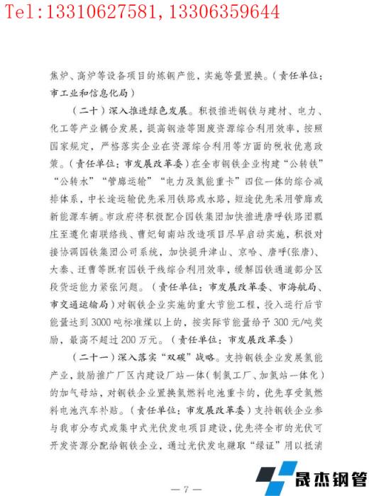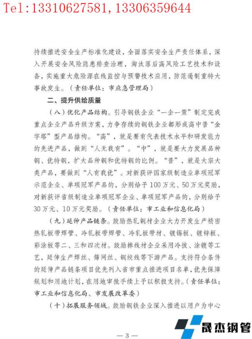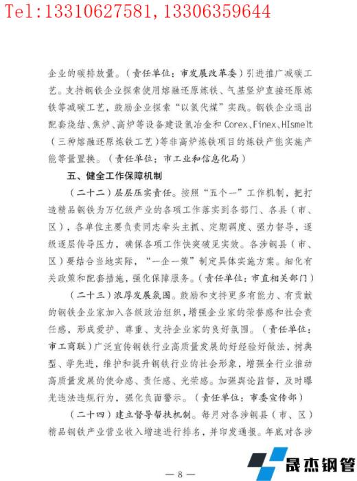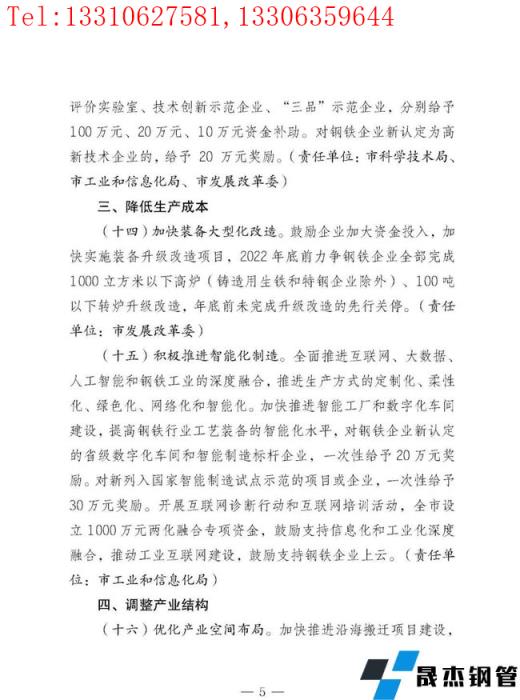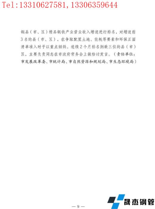 按照"五個一"工作機(jī)制,把打造精品鋼鐵為萬億級產(chǎn)業(yè)的各項工作落實到各部門、各縣(市、區(qū)),結(jié)合當(dāng)?shù)貙嶋H,"一企一策"制定具體實施方案。鼓勵和支持更多有能力、有貢獻(xiàn)的鋼鐵企業(yè)家加入各級政治組織,廣泛宣傳鋼鐵行業(yè)高質(zhì)量發(fā)展的好經(jīng)驗好做法,維護(hù)和提升鋼鐵行業(yè)的社會形象。加強(qiáng)輿論監(jiān)督,及時曝光違法違規(guī)行為。建立督導(dǎo)幫扶機(jī)制。每月、年底對各涉鋼縣(市、區(qū))精品鋼鐵產(chǎn)業(yè)營業(yè)收入增速進(jìn)行排名,對增速前3名的縣(市、區(qū)),在爭取配置土地、能耗等要素和環(huán)保正面清單準(zhǔn)入時予以重點傾斜。