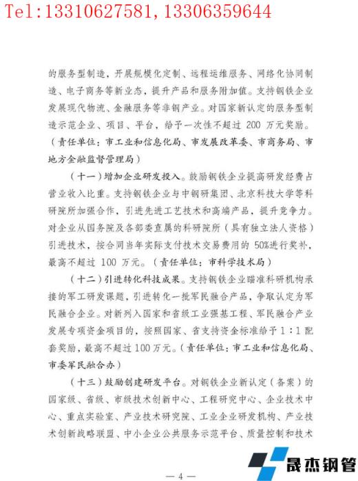 對鋼鐵企業(yè)新認(rèn)定(備案)的國家級、省級、市級技術(shù)創(chuàng)新中心、工程研究中心、企業(yè)技術(shù)中心、重點實驗室、產(chǎn)業(yè)技術(shù)研究院、工業(yè)企業(yè)研發(fā)機(jī)構(gòu)、產(chǎn)業(yè)技術(shù)創(chuàng)新戰(zhàn)略聯(lián)盟、中小企業(yè)公共服務(wù)示范平臺、質(zhì)量控制和技術(shù),評價實驗室、技術(shù)創(chuàng)新示范企業(yè)、"三品"示范企業(yè),分別給予100萬元、20萬元、10萬元資金補(bǔ)助。對鋼鐵企業(yè)新認(rèn)定為高新技術(shù)企業(yè)的,給予20萬元獎勵。