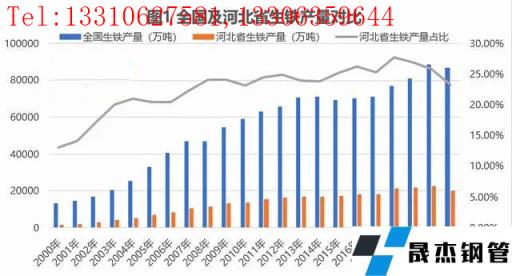 河北省在中國鋼鐵行業(yè)中占據(jù)著舉足輕重的位置,從河北省鋼鐵產(chǎn)量數(shù)據(jù)來看,2021年,河北省生鐵產(chǎn)量為20202.98萬噸,同比下降11.8%,占全國生鐵產(chǎn)量的23.3%(詳見圖1);粗鋼產(chǎn)量為22496.45萬噸,同比下降9.9%,占全國粗鋼產(chǎn)量的21.8%(詳見圖2);厚壁管產(chǎn)量為29559.38萬噸,同比下降1.8%,占全國厚壁管產(chǎn)量的22.1%(詳見圖3)。