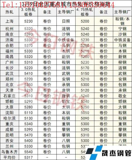 截至3月9日,全國(guó)主要城市3.0熱軋板卷均價(jià)5317元/噸,周環(huán)比上漲64元/噸;4.75熱軋板卷均價(jià)5241元/噸,周環(huán)比上漲63元/噸。以下為3月4日與3月9日全國(guó)重點(diǎn)城市熱軋板卷價(jià)格指數(shù)對(duì)比情況: