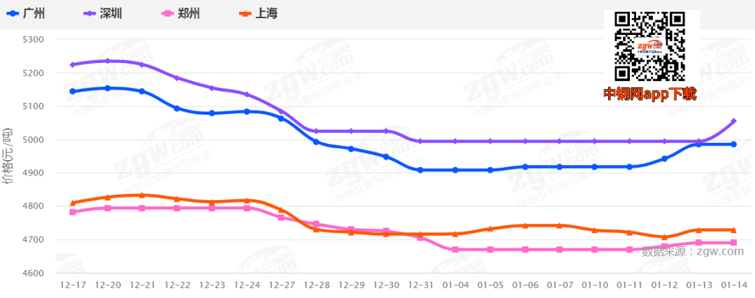 截至1月14日,全國237家流通商周均成交量11.92萬噸,周均成交量環(huán)比減少2.84萬噸,減幅為19.24%。據(jù)不完全統(tǒng)計,40家電弧爐獨(dú)立建筑鋼材生產(chǎn)的鋼廠中,已有25家停產(chǎn),占62.5%。其中,1月1日前停產(chǎn)的鋼廠占24%,而1月1日至1月10日停產(chǎn)的鋼廠占60%,處于鋼廠集中停產(chǎn)階段。根據(jù)市場收集的信息來看,獨(dú)立電弧爐建筑鋼材鋼廠平均成本4817元/噸,周環(huán)比上升93元/噸。當(dāng)前電弧爐鋼廠虧損嚴(yán)重,尤其是飽和生產(chǎn)的情況下,噸鋼虧損超百元。