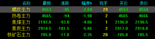今日螺紋主力期貨跌95,收報4553,跌幅2.04%;熱卷主力跌94,收報4665,跌幅1.98%;焦煤主力跌93,收報2197,跌幅4.06%;焦炭主力跌181.5,收報2914.5,跌幅5.86%;鐵礦石主力跌17收報705,跌幅2.35%。