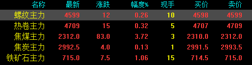 今日螺紋主力期貨漲12,收?qǐng)?bào)4599,漲幅0.26%;熱卷主力漲15,收?qǐng)?bào)4709,漲幅0.32%;焦煤主力漲83,收?qǐng)?bào)2312,漲幅3.72%;焦炭主力漲4,收?qǐng)?bào)2992.5,漲幅0.13%;鐵礦石主力漲7.5收?qǐng)?bào)715,漲幅1.06%。