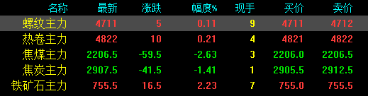 今日螺紋主力期貨漲5,收?qǐng)?bào)4711,漲幅0.11%;熱卷主力漲10,收?qǐng)?bào)4822,漲幅0.21%;焦煤主力跌59.5,收?qǐng)?bào)2206.5,跌幅2.63%;焦炭主力跌41.5,收?qǐng)?bào)2907.5,跌幅1.41%;鐵礦石主力漲16.5收?qǐng)?bào)755.5,漲幅2.23%。