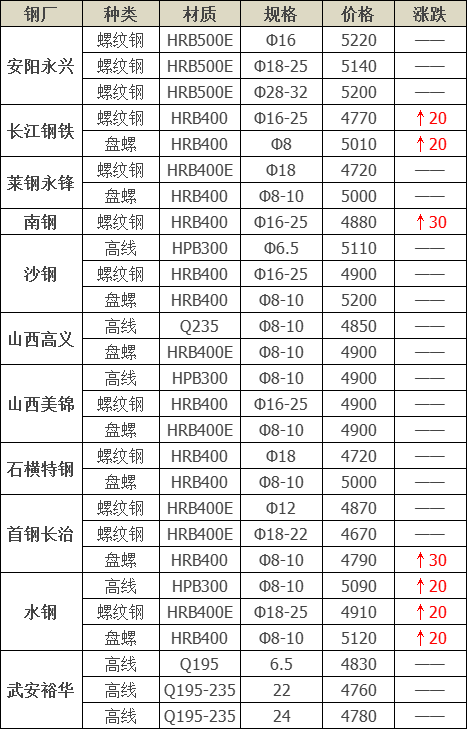 據(jù)數(shù)據(jù)顯示今日共26家鋼廠調(diào)價,其中: