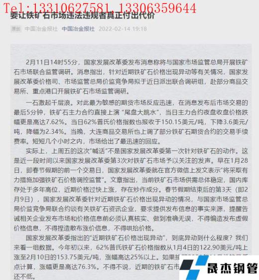 2月9日發(fā)改委價格司、市場監(jiān)管總局價監(jiān)競爭局曾聯(lián)合約談有關(guān)鐵礦石資訊企業(yè),要求提供發(fā)布信息的事實來源,提醒告誡相關(guān)企業(yè)發(fā)布市場和價格信息前必須認真核實,做到準確無誤,不得編造發(fā)布虛假價格信息,不得捏造散布漲價信息,不得哄抬價格。