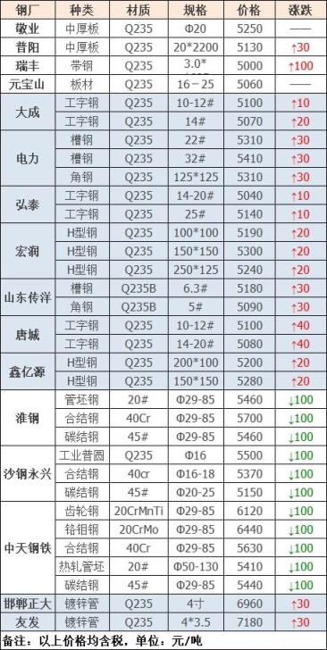 今日無縫鋼管廠家指導(dǎo)價(jià)格以漲為主,部分補(bǔ)跌。今日黑色系期貨持續(xù)上行,成本大幅上漲,市場心態(tài)有所提振,廠家跟漲心態(tài)明顯,下游操作多按需補(bǔ)庫,部分廠商出貨向好,但整體交投一般,預(yù)計(jì)短期無縫鋼管廠家價(jià)格穩(wěn)中偏強(qiáng)。