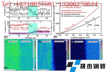 圖 2. EMPA 結(jié)果關(guān)于相鄰層(a 和 c)之間合金元素的含量以及使用 Thermal Calc 軟件(b)計算的碳活性。