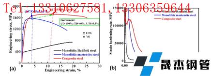 這種新工藝產(chǎn)生的機械性能及其與參考整體鋼的比較如圖3(a) 所示。不僅均勻延展性和總延展性分別提高了 190% 和 40%;與經(jīng)過相同熱加工工藝處理的整體馬氏體鋼相比,屈服強度和極限抗拉強度顯著提高。復(fù)合鋼的應(yīng)變硬化率較高,如圖3(b), 應(yīng)負責(zé)增加的機械性能。這種復(fù)合鋼的強度和伸長率也高于在熱軋元素擴散后沒有最后 5 分鐘打孔工藝的鋼。該結(jié)果直接表明引入碳擴散策略可以同時提高高強復(fù)合鋼的強度和延展性。