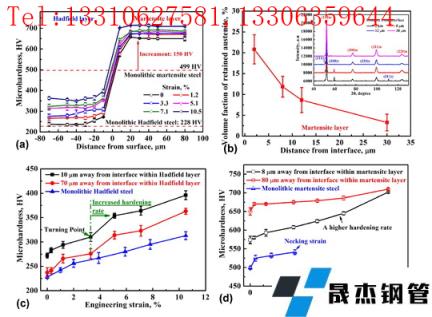 圖 4.復(fù)合鋼的硬度演變及其與整體鋼(a、c 和 d)的比較以及馬氏體層中殘余奧氏體的體積分數(shù)(b)。