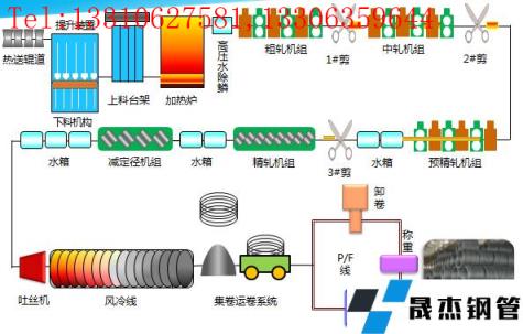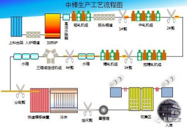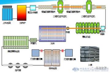 加熱爐、高壓水除鱗、軋機(jī)、輪廓儀或測徑儀、剪或鋸、熱打印機(jī)、冷床、矯直機(jī)、編組臺架、碼垛臺架、打捆機(jī)、稱重設(shè)備、噴標(biāo)等設(shè)備