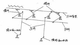 當(dāng)升降驅(qū)動(dòng)電機(jī)驅(qū)動(dòng)偏心軸轉(zhuǎn)動(dòng)時(shí),通過連桿和拉桿使步進(jìn)框架上、下運(yùn)動(dòng),從而帶動(dòng)步進(jìn)梁運(yùn)動(dòng)。因?yàn)槠妮S帶動(dòng)的擺桿和活動(dòng)框架是滾動(dòng)接觸,這樣就可以保證活動(dòng)梁在提升驅(qū)動(dòng)過程中只有升降運(yùn)動(dòng),而無平移運(yùn)動(dòng)。同樣當(dāng)橫移驅(qū)動(dòng)電機(jī)驅(qū)動(dòng)偏心軸轉(zhuǎn)動(dòng)時(shí),通過連桿使擺動(dòng)機(jī)構(gòu)使運(yùn)動(dòng)框架水平移動(dòng)。