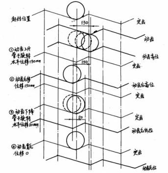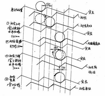 厚壁鋼管在同一個(gè)齒形內(nèi)動(dòng)作,如圖8-4。在一個(gè)周期內(nèi)管子前移距離為四個(gè)步驟位移之和,等于130+(一150)十20+0=0。