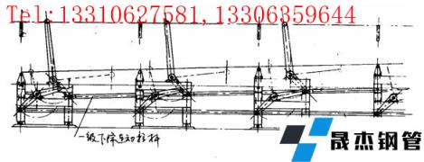 厚壁鋼管離開水槽將自行濃動(dòng)到第一級下降機(jī)構(gòu)的固定梁上,然后被第一級下降機(jī)構(gòu)的活動(dòng)梁接收,第一級下降機(jī)構(gòu)在液壓缸操作下使連桿帶動(dòng)全部活動(dòng)梁運(yùn)動(dòng),將厚壁鋼管送到第二級下降機(jī)構(gòu)的固定梁上,然后通過同樣的動(dòng)作方式將厚壁鋼管送至管排收集臺(tái)架上。厚壁鋼管被第一級下降機(jī)構(gòu)送到第二級下降機(jī)構(gòu)的固定梁的過程中,由于厚壁鋼管在長度方向上下降的高度不同,因而使厚壁鋼管傾斜,使管中殘留的水排出。但通過第二級下降機(jī)構(gòu)送至收集臺(tái)架時(shí),由結(jié)構(gòu)決定使厚壁鋼管下降高度在長度方向恢復(fù)了平衡。這樣厚壁鋼管就可以很穩(wěn)定地進(jìn)入精整鋸切區(qū)域。