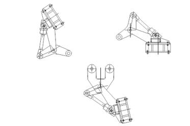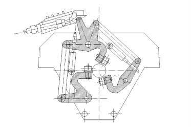 5.2.3.3 平衡裝置由于PQF三輥軋機(jī)軋輥的特殊裝配方式,平衡裝置也配套采用新型設(shè)計(jì),其裝置為液壓缸帶動(dòng)一撥叉,撥叉壓在“C”形臂的“肩”上,壓下裝置的力是向軋制中心線的力,平衡力是反力。由于PQF的布置方式,三個(gè)平衡叉中,上兩個(gè)為單向撥叉,下面的一個(gè)為雙向撥叉。它們的行程為:上兩個(gè):100mm;下?lián)懿妫?1mm。平衡叉結(jié)構(gòu)見(jiàn)圖5-22。