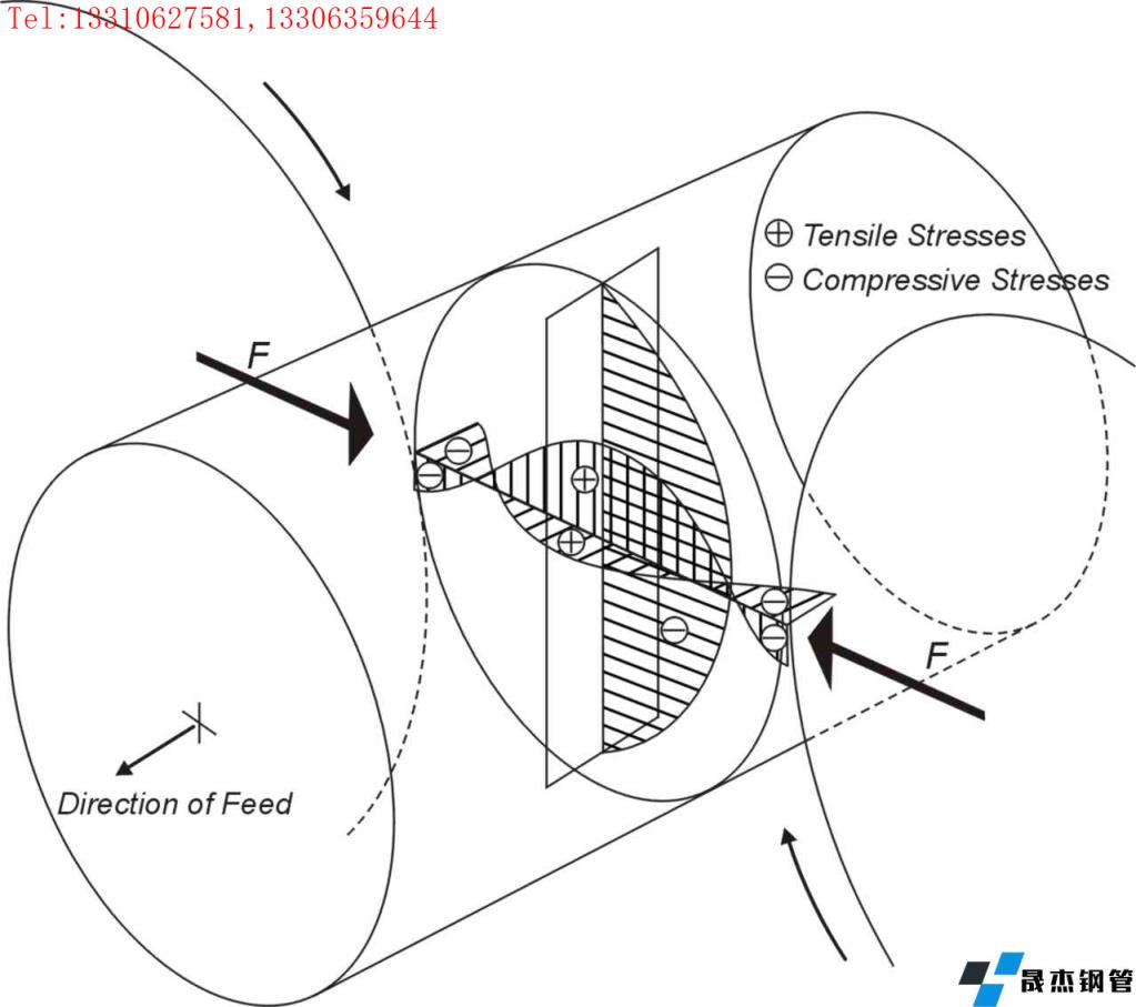 圖4-6顯示管坯的受力情況,圖中顯示F為軋輥方向(平面)的力,為壓應(yīng)力,在接觸點的位置顯示為最大。中心部位(導(dǎo)盤方向)顯示為拉應(yīng)力,理論上在導(dǎo)盤的中心部位受力為最大。因為管坯的不斷旋轉(zhuǎn),同一部位的受力情況不斷變化,導(dǎo)致中心部位的金屬受到交變應(yīng)力的作用,中心產(chǎn)生疏松,形成孔腔。