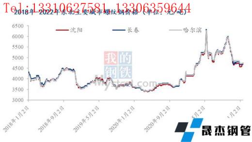 每年進入12月份后、東北建筑鋼材市場因下游工程大部分停工、需求銳減,而無縫鋼管廠多忙于北材南下無暇北顧,供需兩弱狀態(tài)下,價格對成交難以造成較大影響,商家也懶于調(diào)整對外報價,所以市場多數(shù)平穩(wěn)運行為主,而今年進入1月后、市場價格仍出現(xiàn)了比較明顯的反季運行征象,截至2022年1月26日,東北地區(qū)主要建筑鋼材市場HRB400E螺紋鋼φ22mm報收4730-4750元/噸,較2021年12月底拉漲0-180元/噸。