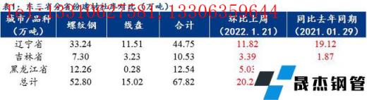 本周東三省建筑鋼材現(xiàn)貨庫存增加較多,增幅明顯超上周,其中螺紋鋼現(xiàn)貨庫存52.8萬噸,線盤15.02萬噸,建材社會庫存總量為67.82萬噸,較上周增20.24萬噸,增幅高達(dá)42.54%。隨著春節(jié)的臨近,北方下游終端工程進(jìn)入全停工狀態(tài),需求已無,出貨趨零,加之各個無縫鋼管廠家廠庫前移至市場各倉庫的現(xiàn)貨相對較多,社庫開始大幅度累庫。