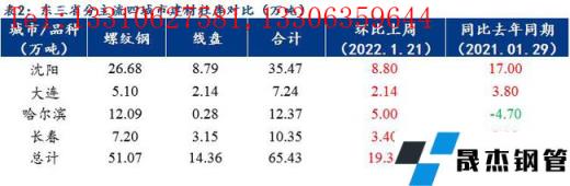 各主流城市分倉庫來看,本周沈陽市場幾大主流倉庫增庫較多;本周大連遠(yuǎn)東鋼材市場新鵬輝到貨較多,其余倉庫新?lián)徜撘苍陉懤m(xù)到貨。吉林省內(nèi)長春兩大主流倉庫現(xiàn)貨庫存也在增加。從無縫鋼管廠家產(chǎn)量及庫存來看,本周區(qū)域內(nèi)樣本無縫鋼管廠家總產(chǎn)量43.1萬噸,較上周增.9萬噸;廠庫總量12.56萬噸,較上周減少1.01萬噸,社庫則大幅度增20.24萬噸;本周無縫鋼管廠家產(chǎn)量增、廠庫降、社庫繼續(xù)大增,主要原因是部分無縫鋼管廠家復(fù)產(chǎn)、產(chǎn)量略有回升,廠庫繼續(xù)前移至市場,而貿(mào)易商由于下游無需求幾乎也無成交,預(yù)計春節(jié)過后區(qū)域內(nèi)社會庫存將繼續(xù)增加。