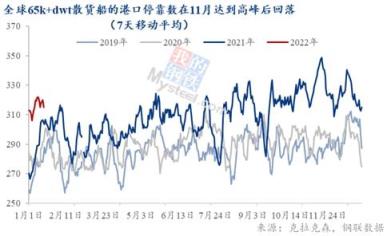 根據(jù)調(diào)研,10月份全球鐵礦石發(fā)運出現(xiàn)了大幅下降,10月環(huán)比降幅達(dá)5.8%至1.33億噸,傳導(dǎo)至12月中國海運鐵礦石進(jìn)口環(huán)比下滑18%,至8500萬噸左右,同比下降11%,至近19個月低點。盡管12月鐵礦石發(fā)運回暖,但是由于10月以及11月運輸需求的下滑,多余運力需要被消化:太平洋板塊率先開始持續(xù)傳導(dǎo)下行壓力,致使租金價格下跌;西澳大利亞至中國C5航線運費于12月10日出現(xiàn)大幅下跌,跨太平洋C10航線也于當(dāng)周緊跟下行趨勢。市場上租家也看空海岬型船海運市場:12月中國至巴西的C14空載航線同樣下跌。與此同時,圣誕節(jié)假期期間也導(dǎo)致了交易節(jié)奏放緩,此外,許多租家也都想盡可能規(guī)避卷土重來的新冠疫情及相關(guān)港口規(guī)定。往后進(jìn)入2022年1月,國際干散貨海運市場正式步入淡季。