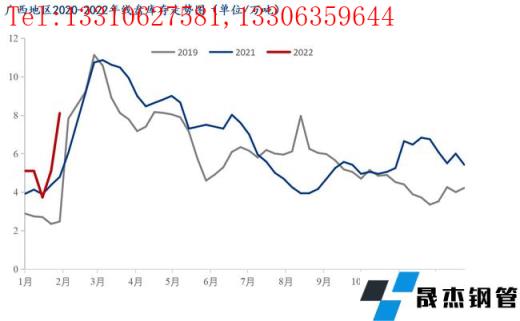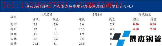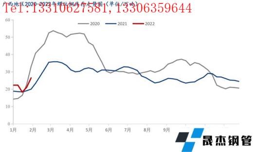 本周廣西建筑厚壁無縫鋼管價格小幅上漲,較節(jié)前上漲80元/噸。春節(jié)期間由于需求停滯,貿(mào)易商提貨較少,多數(shù)滯留在廠內(nèi),因而社庫庫存整體增加幅度較往年有所降低。商家整體心態(tài)尚可,對后市觀望情緒濃厚。截至昨日(正月初六)據(jù)我網(wǎng)跟蹤調(diào)研統(tǒng)計,廣西市場庫存建筑厚壁無縫鋼管34.6萬噸,較節(jié)前相比增加8.4萬噸,較去年節(jié)后同期相比減少5.9萬噸。從區(qū)域數(shù)據(jù)來看,南寧市場主要庫存資源為桂萬鋼,其商戶資源多數(shù)在廠內(nèi),只要節(jié)前零星商戶的資源到本倉庫,以及有云南材等資源,因而整體增加了0.8萬噸;而柳州市場由于柳鋼資源多數(shù)都會發(fā)往物流園,因而資源相對增加幅度較高,較春節(jié)前增加7萬噸。從整體庫存來看,廠家和社會庫存壓力尚在,但是隨著后期需求的釋放,或?qū)⒂兴徑?,短期本地市場價格或?qū)⒗^續(xù)面臨小幅上漲。