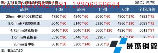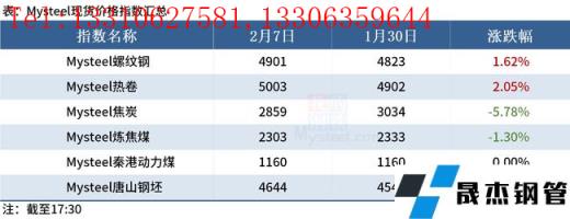 ◎ 2月7日,全國(guó)31個(gè)主要城市螺紋鋼均價(jià)4892元/噸,較節(jié)前(1月30日)上漲75元/噸;全國(guó)24個(gè)主要城市熱軋板卷均價(jià)5011元/噸,上漲97元/噸。