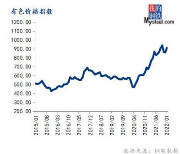 1月份有色價格指數(shù)為910.93,環(huán)比上漲5.88%,同比上漲35.47%。