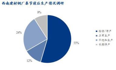1、據調研顯示,西南地區(qū)33家建筑厚壁無縫鋼管生產企業(yè)中,春節(jié)期間有停產檢修計劃18家,占比54.55%,不飽和生產8家,占比24.24%,合計影響產量約235.75萬噸;另4家無縫厚壁鋼管廠家正常生產,3家無縫厚壁鋼管廠家長期停產。