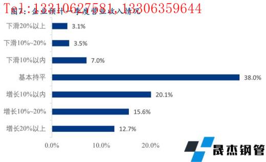 3、對于一季度營業(yè)收入的情況,38.0%的企業(yè)預(yù)計一季度營業(yè)收入與去年同期基本持平,48.3%的企業(yè)預(yù)計一季度營業(yè)收入與去年同期相比有所增長,13.6%的企業(yè)一季度營業(yè)收入同比下降,其中預(yù)計一季度營業(yè)收入增幅20%以上及降幅20%以上的企業(yè)分別占比12.7%和3.1%。