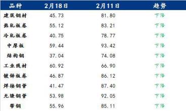 具體各品種指數(shù)來看,2月18日建筑厚壁無縫鋼管情緒指數(shù)為45.73,較2月11日回落36.07;熱軋板卷情緒指數(shù)為55.12,較2月11日回落28.09;冷軋板卷情緒指數(shù)為40.75,較2月11日回落38.02;中厚板情緒指數(shù)為59.44,較2月11日回落33.98;結構鋼情緒指數(shù)為37.04,較2月11日回落37.04;工業(yè)線材情緒指數(shù)為60.92,較2月11日回落5.98;鍍鋅板卷情緒指數(shù)為46.87,較2月11日回落39.25;焊接厚壁鋼管情緒指數(shù)為41.47,較2月11日回落45.93;無縫厚壁鋼管情緒指數(shù)為53.98,較2月11日回落38.07;帶鋼情緒指數(shù)為55.96,較2月11日回落29.15。