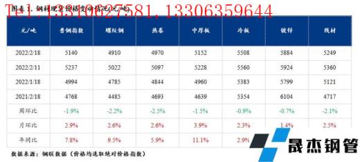 本周普鋼價(jià)格指數(shù)小幅下跌。截至2月18日,普鋼價(jià)格指數(shù)報(bào)5140點(diǎn),環(huán)比跌1.9%;螺紋鋼報(bào)4910元/噸,環(huán)比上周跌2.2%元/噸。本周厚壁無縫鋼管價(jià)格結(jié)束上漲出現(xiàn)回落,原因在于驅(qū)動(dòng)價(jià)格上漲的邏輯出現(xiàn)變化。