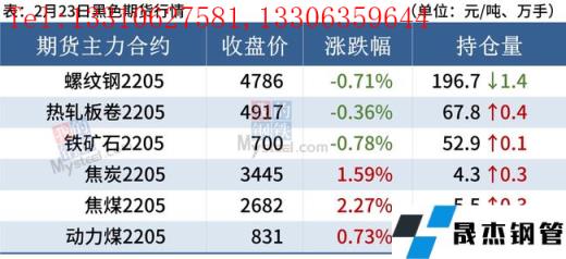 2月23日主要觀點:①、全國31個主要城市20mm三級抗震螺紋鋼均價4930元/噸,較上個交易日跌9元/噸。預計24日國內建筑厚壁無縫鋼管或將維持弱勢運行。②、全國24個主要城市4.75mm熱軋板卷均價5025元/噸,較上個交易日下跌10元/噸。預計24日熱軋板卷價格或窄幅震蕩運行。③、全國24個主要城市1.0mm冷卷均價5575元/噸,較上個交易日下跌5元/噸。預計24日全國冷軋板卷價格或將震蕩偏弱運行。④、全國24個主要城市20mm普板均價5187元/噸,較上一交易日下跌11元/噸。預計24日中厚板價格或將仍以盤整運行為主。⑤、全國45個主要市場廢鋼平均價3195元/噸,較上一交易日價格降1元/噸。預計短期廢鋼市場價格窄幅震蕩運行。⑥、山東進口鐵礦石現貨市場報價先漲后跌,整體交投情緒較為冷清,貿易商多一單一議,無縫厚壁鋼管廠家按需采購。⑦、焦炭市場暫穩(wěn)偏強運行。焦炭第一輪提漲200元/噸,主流無縫厚壁鋼管廠家暫無回應。預計第一輪提漲本周有望落地,預計短期內焦炭市場暫穩(wěn)偏強運行。