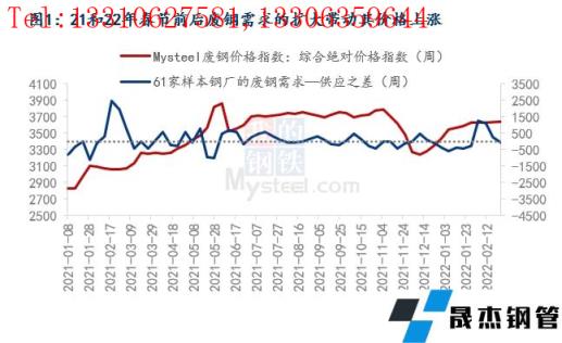 從圖1可以看出,21年和22年的冬儲(chǔ)期間,廢鋼價(jià)格隨著需求的擴(kuò)大出現(xiàn)了上漲,其實(shí)縱觀2021年1月至當(dāng)前的廢鋼價(jià)格走勢(shì),可以看出其走勢(shì)與61家無(wú)縫厚壁鋼管廠家廢鋼的供需變化走勢(shì)有一定的關(guān)聯(lián)性。所以2022年1月以來(lái)廢鋼價(jià)格的走高,其中一個(gè)原因可以認(rèn)為是無(wú)縫厚壁鋼管廠家由于需要冬儲(chǔ)而導(dǎo)致的廢鋼需求增加,拉動(dòng)了廢鋼價(jià)格的上漲。