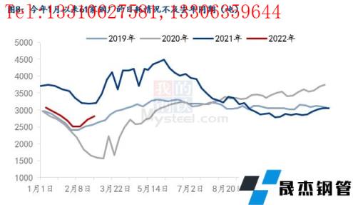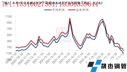 為什么廢鋼資源會(huì)存在階段性偏緊?其實(shí)在第一部分中已經(jīng)討論過(guò),廢鋼資源近幾年內(nèi)都是在每年的1月到節(jié)后的一段時(shí)間內(nèi)存在著供需缺口,主要是因?yàn)閺U鋼加工基地節(jié)前會(huì)放假,節(jié)后復(fù)工較晚導(dǎo)致的市場(chǎng)資源偏緊,無(wú)縫厚壁鋼管廠家因此在這段時(shí)間內(nèi)收廢較為困難,今年也不例外。但今年1月份61家無(wú)縫厚壁鋼管廠家的到貨量同比去年有所降低(圖4所示),到貨量同比有所降低,分析下來(lái)大概有三方面原因:一是由于產(chǎn)廢的制造業(yè)企業(yè)放假較早、房地產(chǎn)行業(yè)的走弱,使得社會(huì)加工廢鋼減少,外加疫情阻礙了廢鋼資源的流通,導(dǎo)致了廢鋼加工基地收廢困難。今年1月293家樣本基地庫(kù)存同比降低有30萬(wàn)噸左右(圖5所示);二是今年1月以來(lái)五大材的總產(chǎn)量低于去年同期(圖6所示);三是電爐廠自今年1月以來(lái)普遍處于虧損的狀態(tài),利潤(rùn)情況要遠(yuǎn)差于去年同期(圖7所示)。后面兩方面原因?qū)е铝藷o(wú)縫厚壁鋼管廠家降低了廢鋼消耗量,所以今年1月以來(lái)61家樣本無(wú)縫厚壁鋼管廠家的廢鋼日耗同比低于去年(圖8所示),需求端的走弱聯(lián)動(dòng)了供應(yīng)端一起走弱。所以以上三方面原因綜合導(dǎo)致了今年1月份來(lái)無(wú)縫厚壁鋼管廠家收廢量不及去年同期。