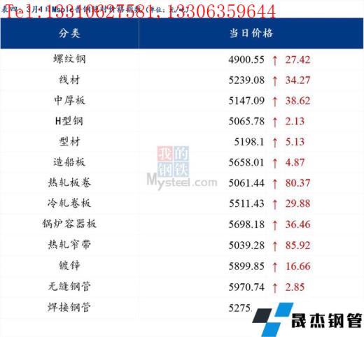 3月1日普鋼絕對(duì)價(jià)格指數(shù)變化:綜合指數(shù)5157.2,上漲42.54;螺紋鋼指數(shù)4900.55,上漲27.42;線材指數(shù)5239.08,上漲34.27;熱軋板卷指數(shù)5061.44,上漲80.37;冷軋板卷指數(shù)5511.43,上漲29.88;中厚板指數(shù)5147.09,上漲38.62。
