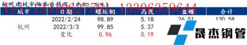 分品種來(lái)看,以杭州市場(chǎng)為例,本周杭州市場(chǎng)建筑厚壁無(wú)縫鋼管總庫(kù)存為130.25萬(wàn)噸,其中螺紋鋼庫(kù)存99.85萬(wàn)噸,周環(huán)比增加0.96萬(wàn)噸,增幅為0.97%;盤螺25.03萬(wàn)噸,周環(huán)比減少1.48萬(wàn)噸,降幅為5.58%;線材5.37萬(wàn)噸,周環(huán)比增加0.19萬(wàn)噸,增幅為3.67%。