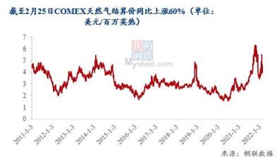 受俄烏沖突影響,截至2月25日,COMEX天然氣結(jié)算價4.485美元/百萬英熱,同比上漲60%。整個2月天然氣均價約為4.459,環(huán)比上漲12%,同比上漲54%,為2014年后的第二高點。