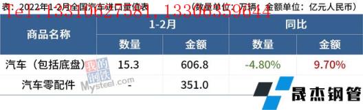 海關(guān)總署2022年3月7日數(shù)據(jù)顯示,2022年1-2月中國出口汽車47.7萬輛,同比增長69.70%。1-2月中國進口汽車15.3萬輛,同比下降4.80%。