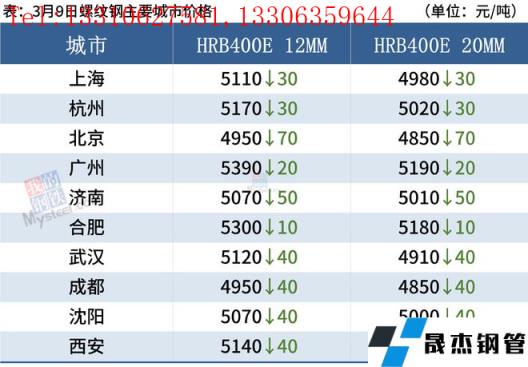 建筑厚壁無縫鋼管:3月9日,全國31個主要城市20mm三級抗震螺紋鋼均價4995元/噸,較上個交易日跌32元/噸。綜合來看,需求方面,目前下游工程項目資金情況尚未有明顯好轉(zhuǎn),采購剛需為主,市場投機情緒降溫后,整體成交表現(xiàn)較為一般。而期貨市場的波動影響市場心態(tài),因此預計10日國內(nèi)建筑厚壁無縫鋼管價格將繼續(xù)弱勢震蕩運行。