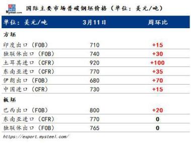 本周印度一批板坯售往意大利,成交價(jià)格為900美元/噸CFR,方坯暫未聽聞成交,報(bào)價(jià)也較少。