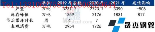 據(jù)樣本數(shù)據(jù)統(tǒng)計(jì),以2020年疫情初發(fā)期間市場(chǎng)情況為例,以2019年數(shù)據(jù)為參考基數(shù)。受疫情影響,2020年春季樣本無(wú)縫厚壁鋼管廠家受疫情影響供給影響螺紋鋼產(chǎn)量508萬(wàn)噸,同時(shí)春節(jié)后累庫(kù)周期增加3周,表觀消費(fèi)減少1228萬(wàn)噸,消費(fèi)供給影響比約為2.42:1。