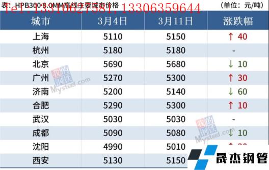 截至3月11日,全國(guó)主要城市20mm三級(jí)抗震螺紋鋼均價(jià)4952元/噸,周環(huán)比上漲6元/噸;8.0mmHPB300高線均價(jià)5164元/噸,周環(huán)比上漲3元/噸。