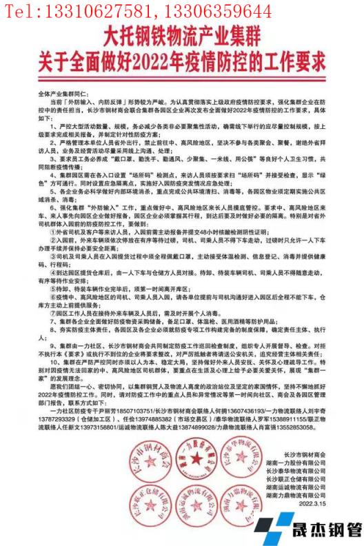 繼3月14日長沙新增1例外省輸入新冠病毒核酸檢測初篩陽性后,相關(guān)部門已立即采取應(yīng)急處置措施。據(jù)小編了解,為認(rèn)真貫徹上級政府疫情防控要求,本地鋼鐵生產(chǎn)企業(yè)加強防控,層層核實人員情況,目前生產(chǎn)供應(yīng)情況一切正常。厚壁無縫鋼管市場交易活動有序進行,暫無工地受此影響停工。為防患于未然,長沙市厚壁無縫鋼管商會聯(lián)合集群各園區(qū)企業(yè)再次發(fā)布全面做好2022年疫情防控的工作要求,具體情況如下: