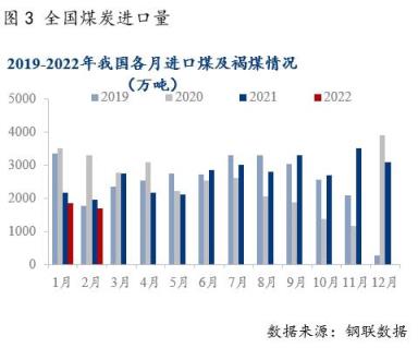 1-2月我國進(jìn)口煤同環(huán)比大幅下降。2022年1-2月進(jìn)口煤炭3539萬噸,同比下降14.0%,降幅比上年12月份收窄6.9個百分點。主要是受印尼1月煤炭禁止出口政策影響,影響1月下旬以及2月中上旬我國煤炭進(jìn)口到港,疫情影響我國288口岸蒙煤通關(guān)量下降至100車左右,導(dǎo)致1-2月我國煤炭進(jìn)口量同比大幅回落。2月下旬海外地緣沖突爆發(fā),短期對我國進(jìn)口有一定影響,對2月影響體現(xiàn)不大。