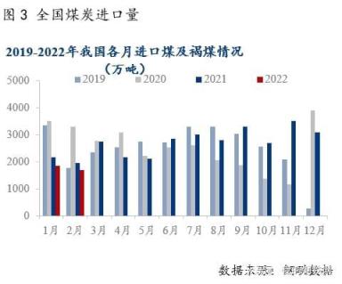 1-2月我國進口煤同環(huán)比大幅下降。2022年1-2月進口煤炭3539萬噸,同比下降14.0%,降幅比上年12月份收窄6.9個百分點。主要是受印尼1月煤炭禁止出口政策影響,影響1月下旬以及2月中上旬我國煤炭進口到港,疫情影響我國288口岸蒙煤通關(guān)量下降至100車左右,導(dǎo)致1-2月我國煤炭進口量同比大幅回落。2月下旬海外地緣沖突爆發(fā),短期對我國進口有一定影響,對2月影響體現(xiàn)不大。