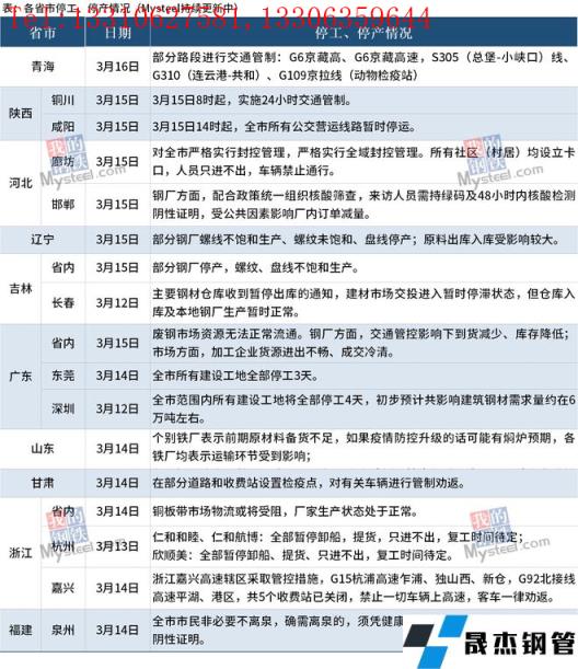 截至3月16日,匯總了10個省份最新停工停產(chǎn)信息。其中,廣東省3月15日開始,廢鋼市場資源無法正常流通;無縫厚壁鋼管廠家方面,交通管控影響下到貨減少、庫存降低;市場方面,加工企業(yè)貨源進(jìn)出不暢、成交冷清。陜西省銅川市于15日宣布全市范圍內(nèi)實施24小時交通管制;咸陽市15日宣布全市所有公交營運路線暫時停運。吉林省部分無縫厚壁鋼管廠家停產(chǎn),螺紋、盤線不飽和生產(chǎn)。與此同時,全國其他地區(qū)鋼貿(mào)交易也受到影響,部分工地開始停工,物流運輸暫停服務(wù)。具體情況如下: